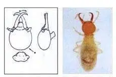 ปลวกในวรรณะทหารมีลักษณะหัว ค่อนข้างคล้ายรูปไข่ สีน้ำตาลเหลือง